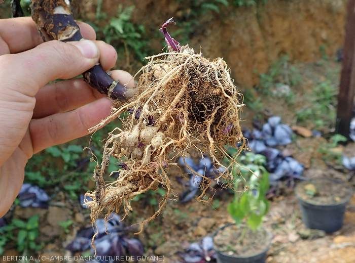 Galles blanches brunissant progressivement, leurs tailles peut varier en fonction des espèces de Meloidogyne.