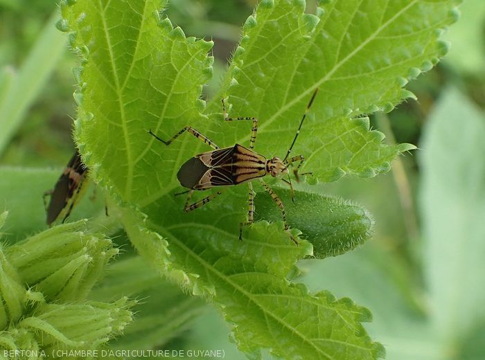 - Punaise parasitant de nombreuses plantes comme le soja, le riz, divers légumes (aubergine, concombre, tomate, poivron, haricot ), ainsi que des adventices qui assurent sa multiplication et servent de sources d'infestation.