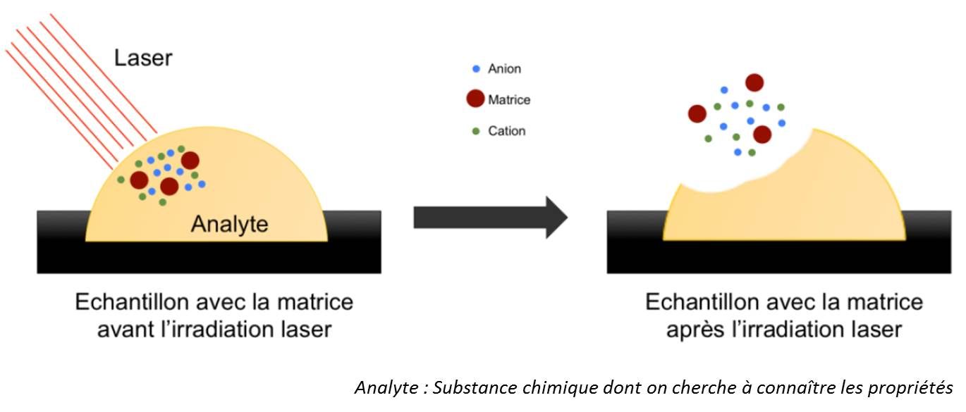 Il s’agit de placer l’échantillon sur une plaque cible en acier inoxydable et d’ajouter une solution matrice qu’il convient de laisser sécher pendant quelques minutes. L’addition de cette matrice permet une co-cristallisation rapide sur la plaque cible. La taille et les intensités des pics des molécules détectées sont tributaires de la matrice choisie pour l’expérience. L’échantillon est ensuite analysé par exposition à un faisceau laser pulsé fixe. Il y a un transfert d’ions entre les molécules de la matrice et celles de l’échantillon. Ainsi selon leur structure, les différentes protéines de l’échantillon vont se charger positivement ou négativement, elles sont alors ionisées.