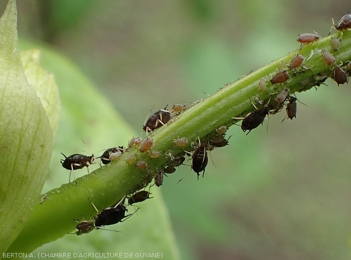 • En cas de population importante, les pucerons de par leurs piqures de nutrition entrainent un affaiblissement général de la plante et une diminution du rendement.