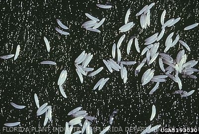 En fonction de la température, les larves (blanc-jaunâtre avec deux yeux noirs) se développent en une quinzaine de jours en se nourrissant de la pulpe du fruit à 25°C. L'optimum de température pour le développement de la mouche des fruits se situe à 32°C. Ceratitis capitata peut compléter 6 à 7 générations par an.