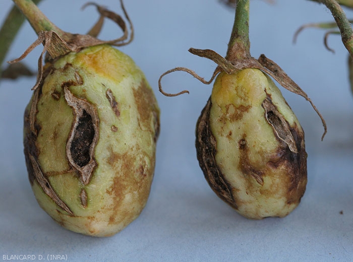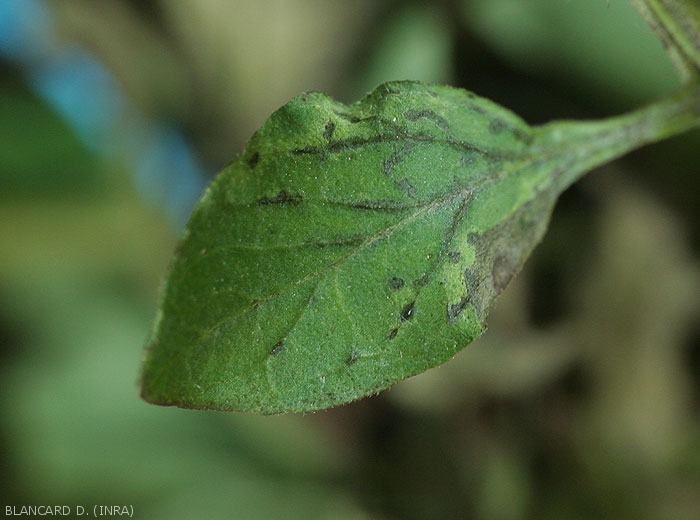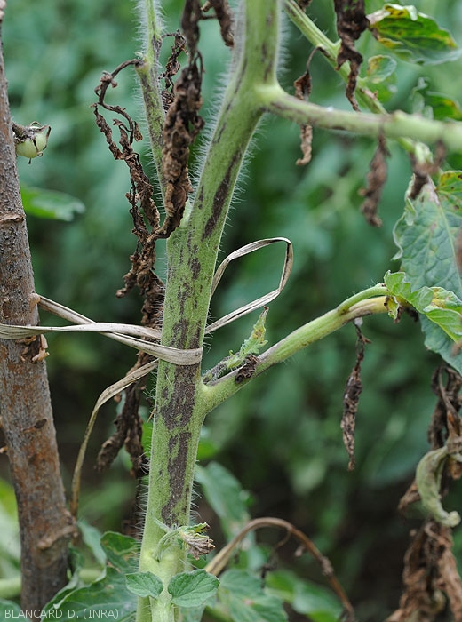 - Lésions nécrotiques allongées (streak) sur pétioles et tiges (figures 8 et 9-tomate ; 19-poivron).