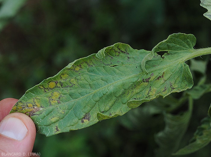 - Petites taches foliaires chlorotiques à nécrotiques (figures 1 et 2-tomate ; ), lésions nervaires (figure3), présence d'anneaux bruns (figure 4, 5, 11-tomate ; 15 à 18-poivron). Les taches nécrotiques confluent et entraînent la nécrose et le dessèchement de folioles entières (figure 6-tomate.