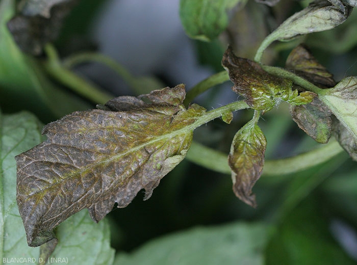 - Plages rouges à brunes ayant tendance à se concentrer et à confluer à la base des folioles. Dans certains cas, les feuilles deviennent anthocyanées.