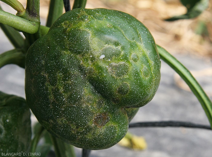 - Réduction du nombre de fruits, qui sont déformés et de taille réduite. De larges arabesques, des anneaux parfois concentriques (figure 20-poivron), des plages décolorées parfois bronzées, des taches nécrotiques sèches et craquelées sont également visibles (figures 12-tomate ;.