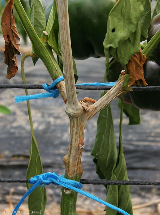 Lésions allongées sur tigess'initiant à partir de tissus sénescents ou blessés (fruits avortés, vrilles, pièces florales, feuilles sénescentes, blessures de taille et diverses...). Celles-ci peuvent être localisées à proximité du collet ou réparties sur la longueur des tiges. Elles ont une apparence humide et sombre dans un premier temps, puis se nécrosent et prennent une teinte beigeâtre et brune, et finissent par les ceinturer sur plusieurs centimètres (figures 1 à 4).