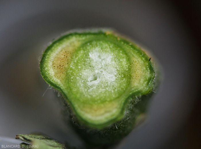 - Brunissement plus ou moins marqué des vaisseaux de la partie basse de la tige s'étendant dans le temps et gagnant les rameaux.