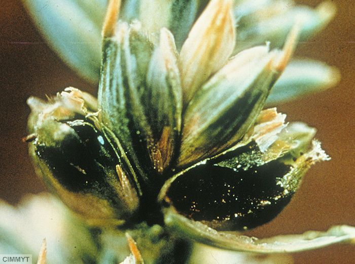 Grains : coloration olivâtre puis noire, remplis de spores noires, friables à la récolte pour Tilletia indica, T. foetida et T. tritici, durs et difficiles à écraser pour Tilletia controversa