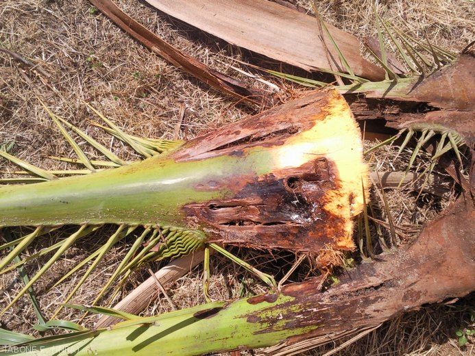 - Présence de perforations sur le rachis des palmes pour Phoenix canariensis observables au moment de la taille des palmiers (courant été)