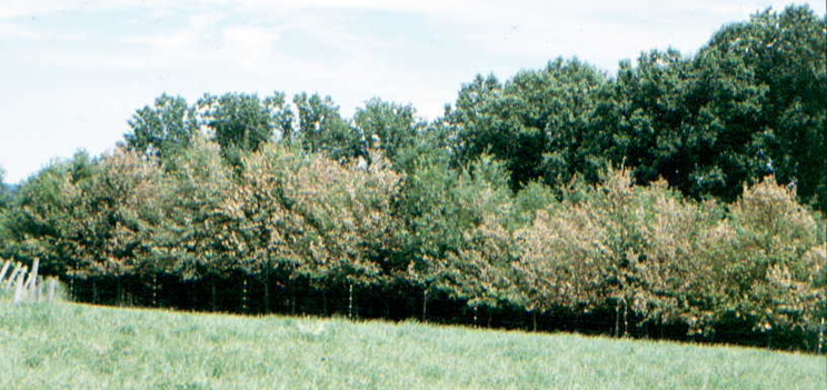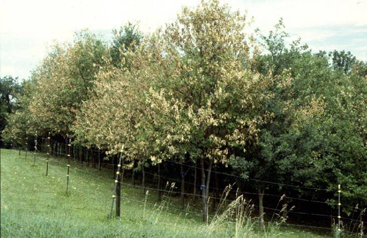 - flétrissement et brunissement rapide du feuillage commençant à la cime de l'arbre et aux extrémités des branches puis dans toute la couronne. Ces symptômes apparaissent d'abord en mai et persistent pendant toute la saison de croissance. Chaque feuille brunit progressivement, de l'extrémité à la base, laissant parfois une petite zone de tissu vert à la base, autour de la nervure médiane (figures 5 et 7).