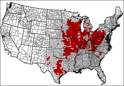 De nombreuses espèces de chênes (Quercus spp.) sont sensibles au flétrissement, avec toutefois des niveaux de vulnérabilité très différents. La maladie n’est présente qu’aux USA (figures 1 et 2). En Europe B. fagacearum est un organisme de quarantaine et donc soumis à des mesures de contrôle à l’import et d’éradication en cas de détection.