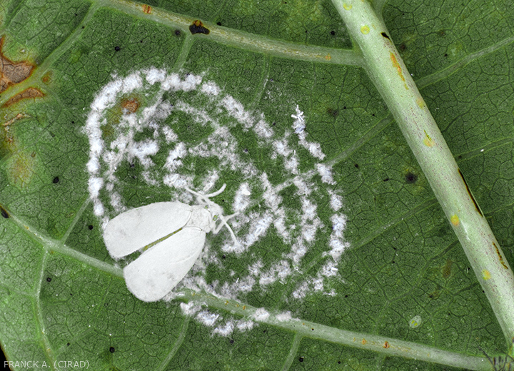 L'adulte forme des spirales lorsqu'il pond des œufs sur la face inférieure des feuilles ou sur les fruits.