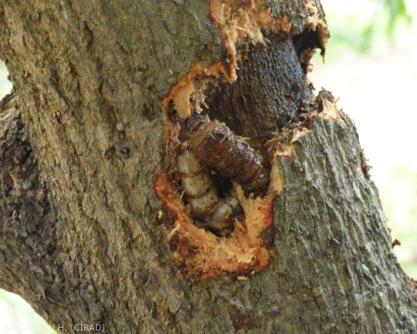 - Les larves, appelées également « Zendettes » en créole réunionnais, creusent des galeries à l'aide de leurs puissantes mandibules à l'intérieur des troncs et des branches.