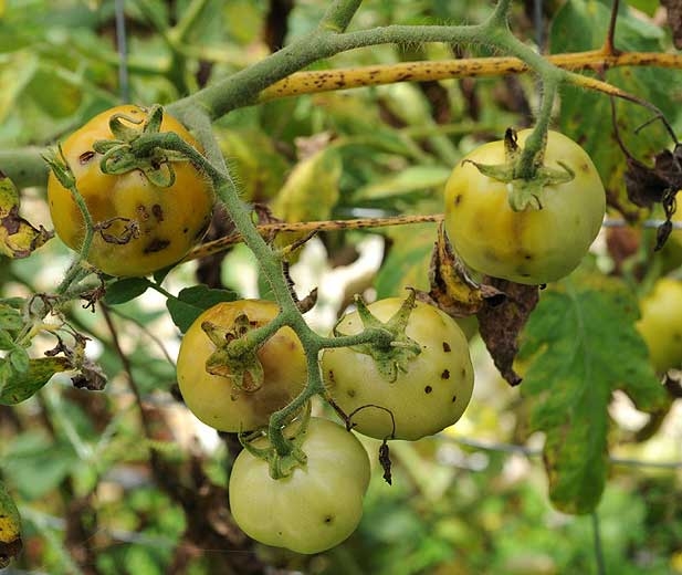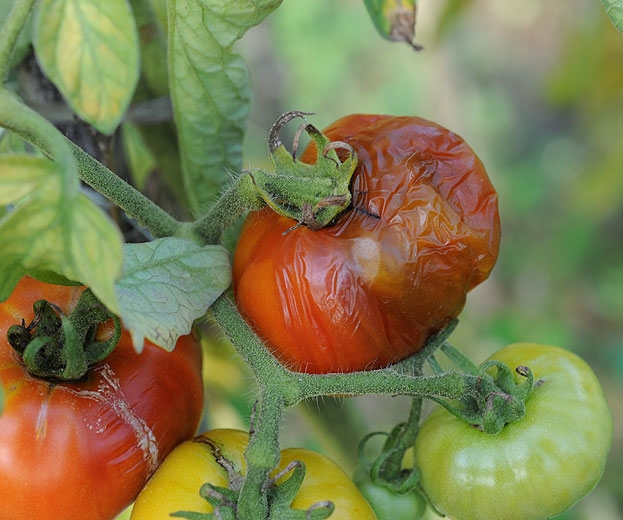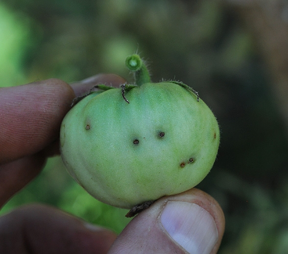 Les fruits affectés présentent des ponctuations correspondant aux piqûres des adultes ; ils sont généralement bien visibles (figures 6 et 7). Parallèlement au développement et aux dégâts liés à l'activité des asticots, les fruits sont colonisés par divers bioagresseurs pathogènes ou opportunistes qui entraînent progressivement leur pourriture (figures 8 à 10). A Mayotte, cette espèce provoque des dégâts importants sur tomate, qui peuvent atteindre la majeure partie de la récolte en l'absence de traitement.