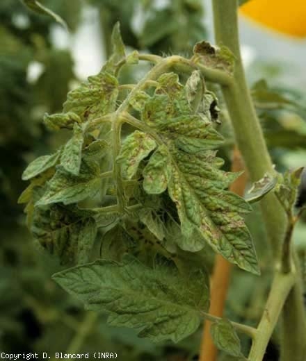 Par la suite, les zones affectées s'étendent et les folioles, plutôt chlorotiques, prennent une teinte bronzée à l'origine du nom de « maladie bronzée de la tomate » (figure 7). Il en est de même pour les taches nécrotiques qui confluent et entraînent la nécrose et le dessèchement de folioles entières. Des lésions nécrotiques (streak) peuvent apparaître sur les pétioles et les tiges. Après plusieurs semaines, les pieds malades peuvent être entièrement nécrosés. Des flétrissements sont parfois observés.