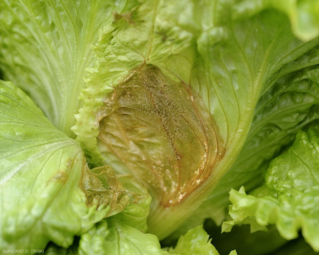 Des attaques plus aériennes sur les jeunes feuilles de la pomme se produisent également (figure 9). Des taches humides et brunes (figures 10 à 12) se développent plutôt en bordure du limbe. Elles donnent naissance assez rapidement à une pourriture de même nature qui se généralise à la pomme (figure 14). Cela peut être le cas sur des salades récoltées trop tardivement. En Chine, des dégâts sur la tige de la laitue sont également constatés.