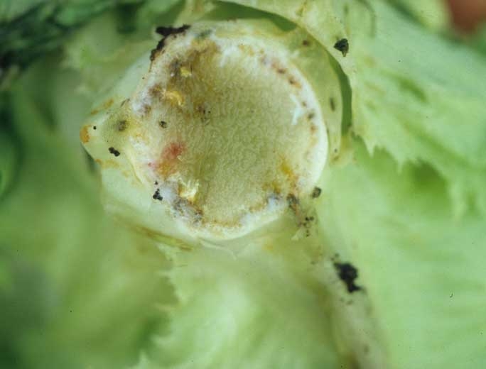 Les salades affectées par Pectobacterium carotovorum subsp. carotovorum flétrissent assez rapidement dans un premier temps. Ce symptôme apparaît à la suite de périodes pluvieuses ou dans des parcelles trop irriguées, à proximité de la récolte. En fait, il est induit par l'envahissement des vaisseaux de la tige et du pivot par cette bactérie (figure 1). Une coupe longitudinale ou transversale de ces organes permet de constater que les vaisseaux montrent une coloration rose qui évolue rapidement au brun (figure 2). La moelle est particulièrement affectée (figures 3 et 4). Elle devient vitreuse et gélatineuse et prend une teinte verdâtre avant de noircir et se liquéfier entièrement sous l'effet d'enzymes pectinolytiques ("butt rot", "jelly butt").