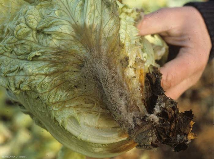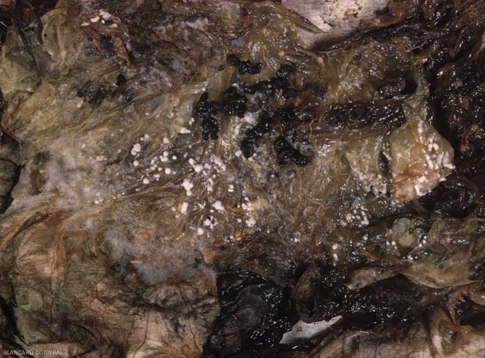 Trame mycélienne blanc grisâtre, moisissure grise constituée de nombreux conidiophores et conidies (figure 5). Mycélium blanc et gros sclérotes noirs, apothécies parfois dans l'environnement