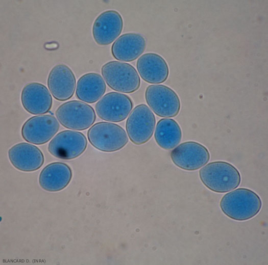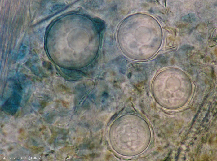 • Les oospores (figures 2 à 4) matérialisent sa forme sexuée (téléomorphe) et assurent sa conservation hivernale dans les tissus foliaires. De couleur jaune, elles mesurent entre 25 et 40 µm de diamètre. Elles germent au printemps et donnent naissance à une macroconidie (figure 3) se formant à l'extrémité d'un filament mycélien. Plutôt piriforme, cette macroconidie mesure 23-27 x 30-41 µm et produit plusieurs dizaines de zoospores piriformes à ovoïdes (figure 4), mesurant 4-5 x 6-10 µm, et mobiles grâce à deux flagelles.