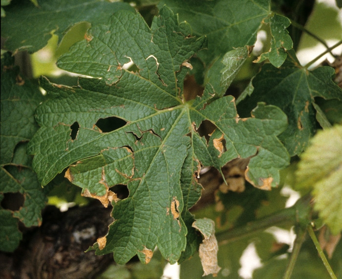 A la suite de pluies importantes, accompagnées de grêle, il n'est pas rare d'observer des dégâts dans les vignes liés aux impacts des grêlons sur la végétation. Ces derniers, en percutant les feuilles, les cannes et les grappes, occasionnent des dégâts qui peuvent fortement affecter le potentiel photosynthétique des feuilles, la résistance des sarments et l'intégrité des baies de raisin (Figures 1 à 6).