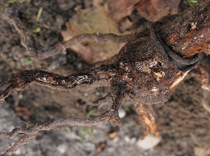 Ces trois agents de pourridié s'attaquent essentiellement aux racines de la vigne. C'est sur ces dernières que se manifestent les tous premiers symptômes.
