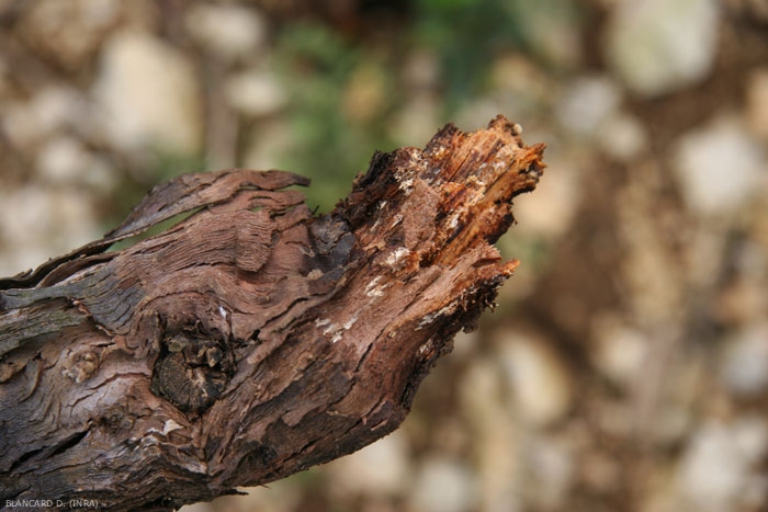 • une forme apoplectique à l'origine d'un flétrissement brutal généralisé ou partiel du cep. Dans ce dernier cas, un à plusieurs bras morts pourront être constatés l'année suivante. Les feuilles finissent par se dessécher et chuter. Notons que cette forme apoplectique peut survenir sur des pieds d'apparence saine généralement très fructifères ou sur des ceps déjà dépérissants.