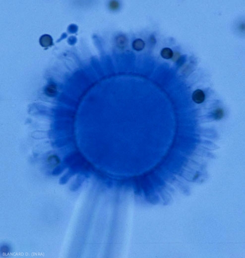 - Les conidies sont sphériques et légèrement aplaties, marron à noires, rugueuses (verruqueuses) et dont le diamètre oscille généralement entre 4 et 5µm. Elles sont agencées en chaînes radiales basipètes.