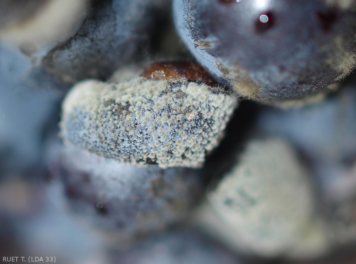 D'autres symptômes sont associés aux dépérissements à Botryosphaeriaceae : réduction de vigueur, croissance réduite de jeunes pousses, chlorose foliaire, nécroses et mortalités de bourgeons, retard de débourrement, blanchiments d'écorce ou décolorations de rameaux. On peut aussi abserver des altérations sur baies de raisin (figures 5 et 6).
