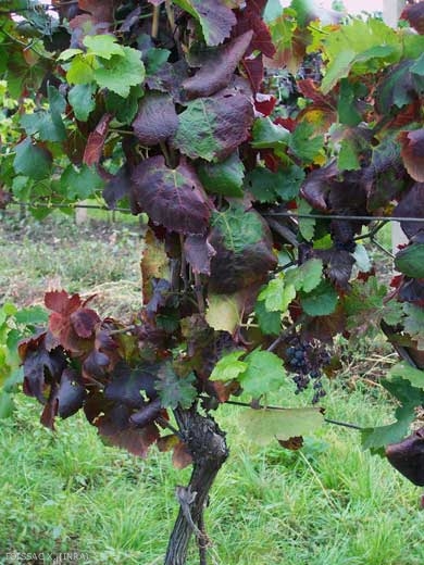 - à la véraison, le limbe des feuilles se durcit et devient cassant, se décolore (les cépages blancs jaunissent, les cépages rouges rougissent) (figures 2 et 3) et s'enroule plus ou moins selon les cépages. Les grappes peuvent manifester un dessèchement des baies s'initiant à partir de la rafle. Si l'on s'intéresse à la qualité organoleptique des baies produites par les ceps malades, celles-ci sont fibreuses ce qui leur confère un goût amère et aigre. Il est bien évident que le vin produit par la suite est de piètre qualité et souvent difficilement commercialisable.