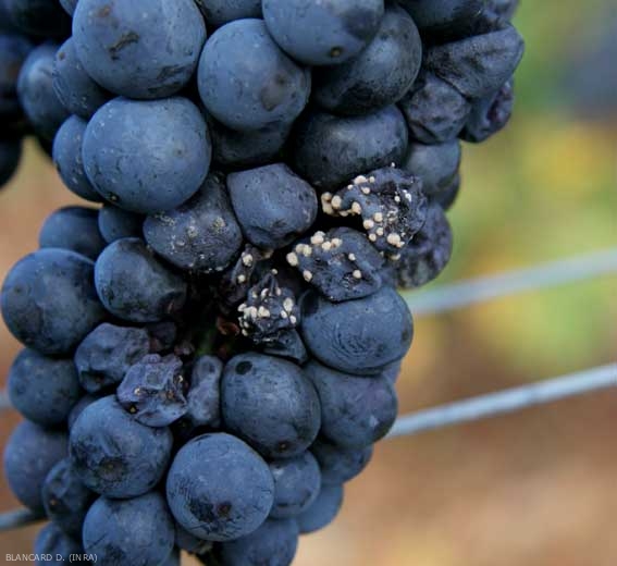 - Les baies de raisin s'assombrissent et se ratatinent progressivement, formant à terme des momies une fois totalement desséchées.