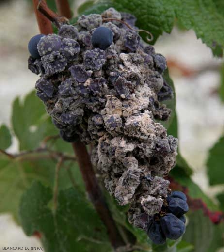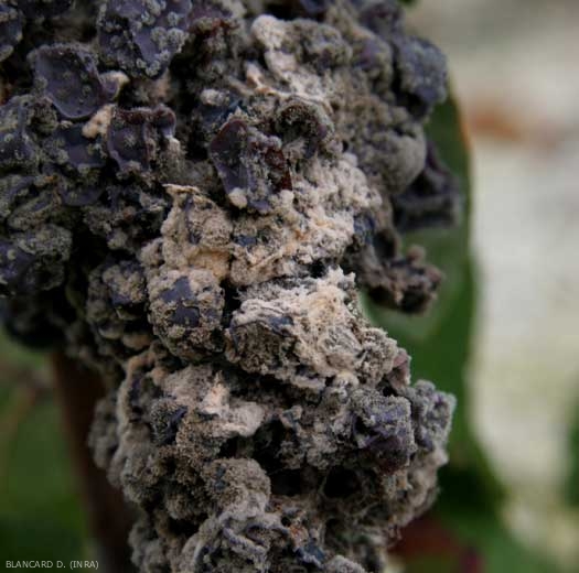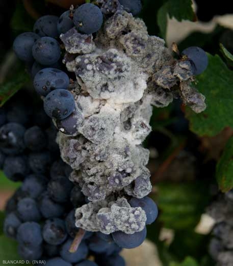 Ainsi, on peut observer sur les grappes botrytisées le développement d'une moisissure assez caractéristique, blanchâtre à rosâtre, couvrant progressivement la moisissure grise  (Figures 1 à 4).