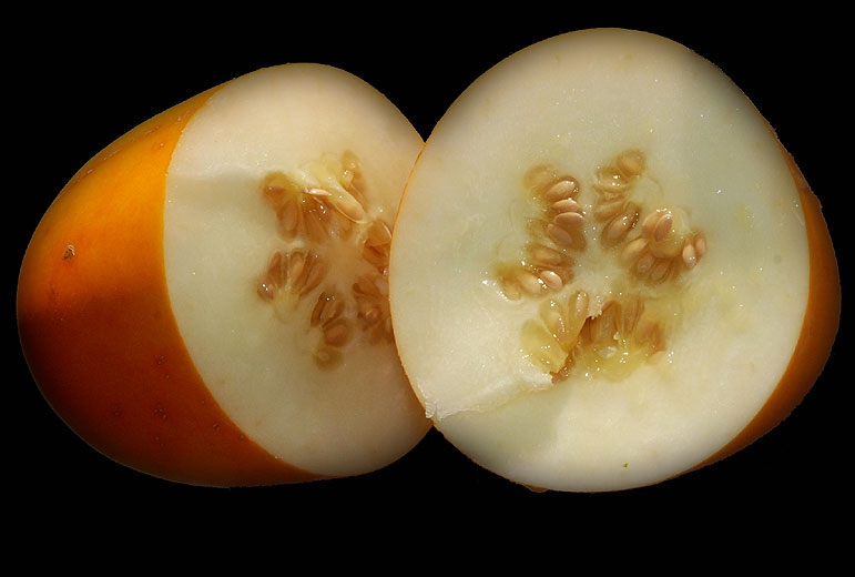 • Fruit ovale ou elliptique, lisse, de couleur verte ou orange uniforme ou bien avec des rayures ou des taches.