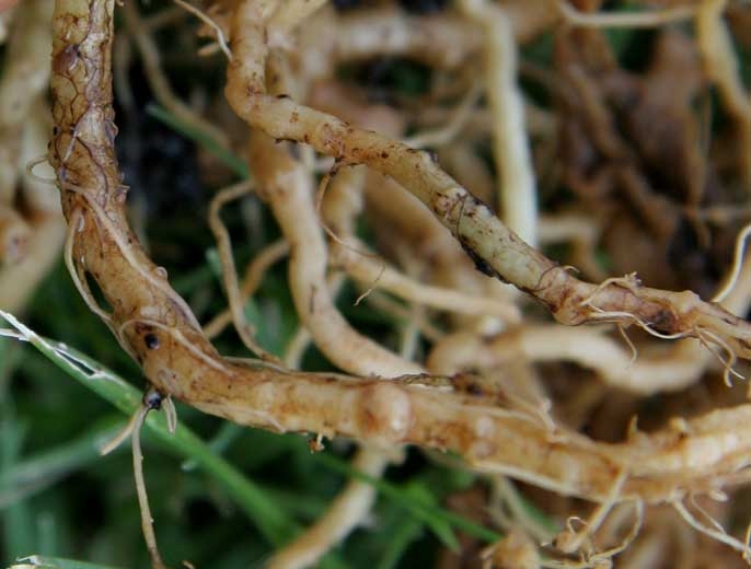 - jaunissement, brunissement et disparition des petites racines nourricières ;