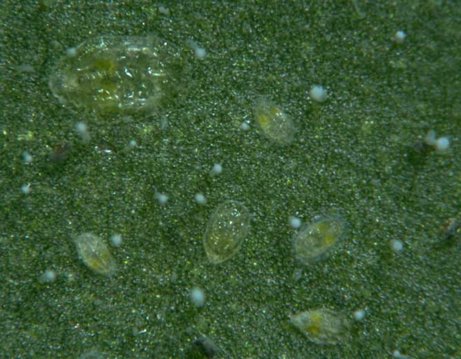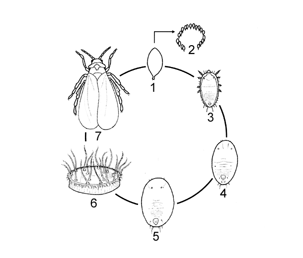 Stades de développement : les oeufs  (figure 2-1 et 2) (figures 4 et 5) sont surtout déposés à la face inférieure des folioles de l'apex. De couleur blanche, ils sont ovales et ont un diamètre de 0,25 mm. Dans les jours qui suivent la ponte, ils deviennent foncés. Entre 7 et 10 jours après, a lieu l'éclosion des larves (figures 2-3)(figures 6 et 7) ; celles-ci, ovales et plates, mesurent 0,3 mm et possèdent des antennes et des pattes bien développées. Perdant ces dernières par la suite, elles sont immobiles et se nourrissent avec leur rostre. Les larves de deuxième stade sont aplaties, transparentes et mesurent 0,37 mm. Les troisième et quatrième stades larvaires sont assez comparables (figure 2-4 et 5), avec toutefois des longueurs respectives de 0,51 et 0,73 mm. Au dernier stade larvaire, l'insecte secrète de la cire. C'est à l'apparition de ses yeux rouges qu'il est qualifié de puparium (figure 2-6) (figure 8). Par la suite, l'aleurode se développe et prend une teinte blanche. Les adultes (figure 4-7) (figures 9 et 10) ont 2 paires d'ailes, leur taille différente selon le sexe : 1,1 mm pour les femelles et 0,9 mm pour les mâles. Le corps et les ailes sont recouverts d'une poudre cireuse blanche caractéristique. De légers critères morphologiques (consultables dans le tableau ci-dessous) permettent de différencier les deux insectes. Les larves et les adultes, souvent présents à la face inférieure du limbe, se nourrissent grâce à leur rostre qui fait office de pompe aspirante. Le sucre en excès contenu dans la sève est rejeté sous la forme de miellat, surtout par les grosses larves.
