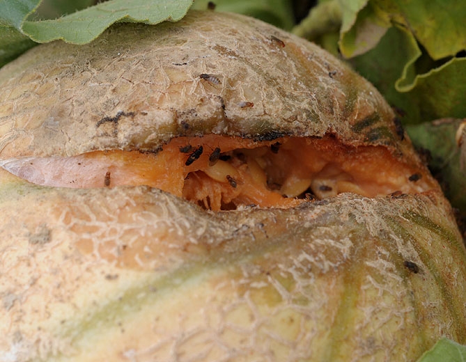 Une légère odeur acide peut accompagner ces pourritures sur melon, ainsi que la présence de drosophiles (figure 7).