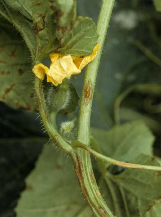 <b><i>Cladosporium cucumerinum</i></b> est à l'origine de ces nombreux éclatements  chancreux longitudinaux sur tige et pétiole de melon. Un dense duvet gris vert couvre les lésions. (cladosporiose)