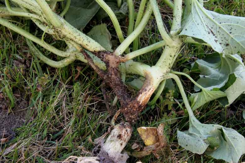 Ce jeune plant de melon greffé a flétri ; il présente un chancre au niveau du point de greffe. <i><b>Didymella bryoniae</b></i> (chancres gommeux sur tige, gummy stem blight)