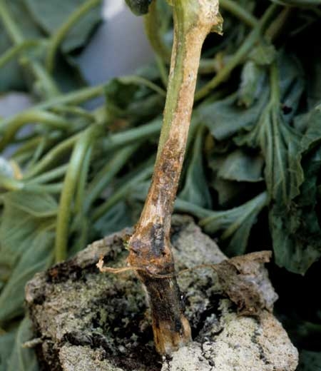 Altération d'abord humide, puis marron foncé, couvrant une portion importante de cette tige de melon. Il faut noter la grande quantité d'exsudats gommeux et les petits points noirs (périthèces ou pycnides) sur cette dernière. </b><i>Didymella bryoniae</i></b>