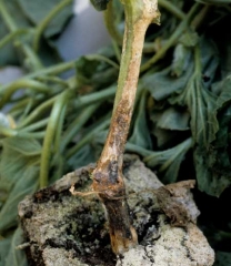 Une lésion nécrotique s'étend sur un tronçon important de cette tige de melon. De teinte beige à brune, elle est partiellement couverte d'exsudats gommeux brun rougeâtre bien visibles. <i><b>Didymella bryoniae</b></i>