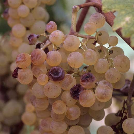 Plusieurs baies de ces quelques grappes contigües sont plus ou brunes et altérées. <i><b>Alternaria</i> sp.</b> (pourriture à <i>Alternaria</i>)