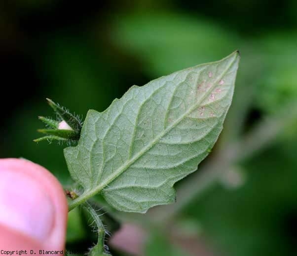 Sur la face supérieure de cette foliole, les lésions ont une teinte beigeâtre à métallique. <b><i>Frankliniella occidentalis</i></b> (thrips)