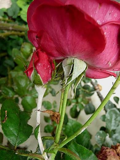 Ces boutons floraux de rosier sont partiellement couverts d'un feutrage blanchâtre, dense et poudreux, produit par l'oïdium.