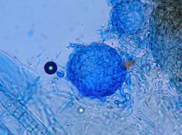 Plusieurs jeunes fructifications en cours de développement sont visibles au microscope photonique dans des tissus lésés. <i><b>Didymella bryoniae</b></i>