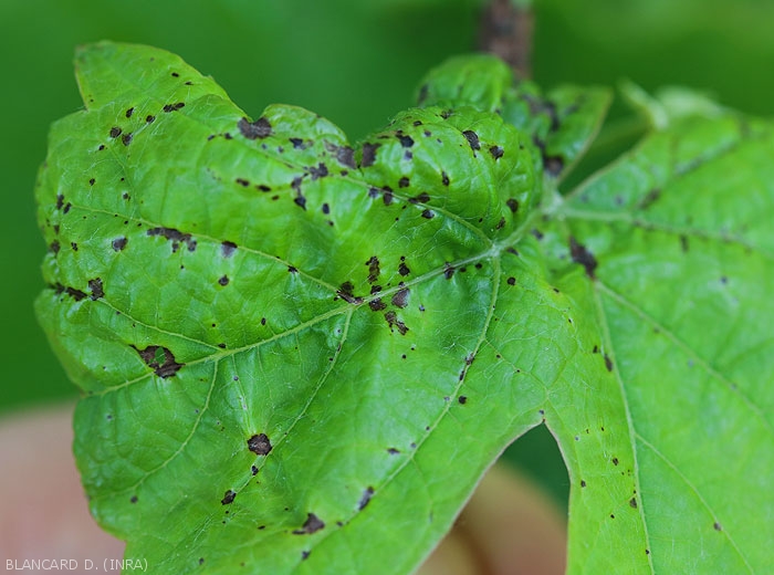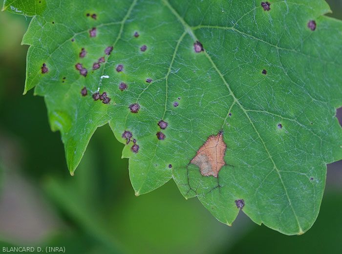 Des taches brun rougeâtre de plusieurs millimètres de diamètres persillent le limbe de cette feuille de vigne. Notez qu'elles sont plus ou moins angulaires et disposées le long des nervures. <i><b>Elsinoë ampelina</b></i> (Anthracnose)