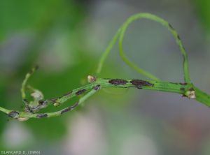 L'extrémité de cette jeune pousse est presque entièrement altérée. Les jeunes feuilles aux tissus tendres  sont entièrement nécrosées, tandis que de nombreuses lésions chancreuses, parfois confluantes, couvrent la tige herbacée. <i><b>Elsinoë ampelina</b></i> (Anthracnose)