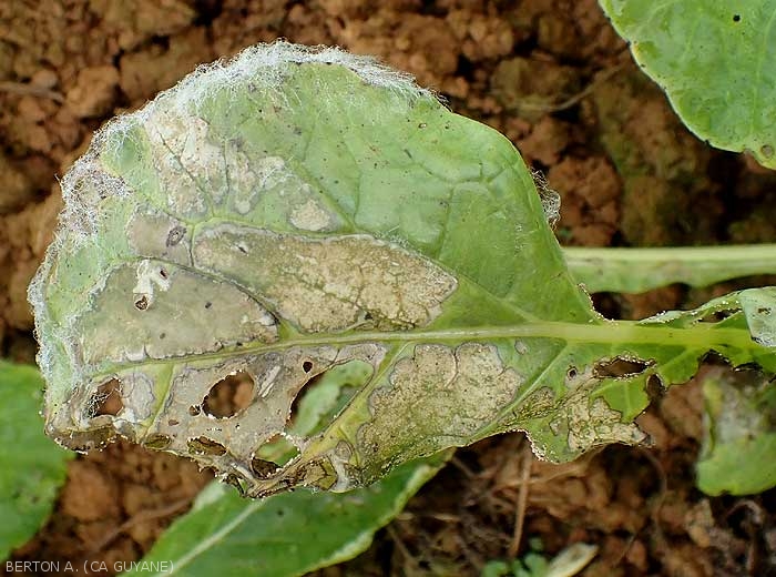 "Proliferations mycéliennes" sur feuille de chou petsai. Le jeune mycélium récemment formé est encore blanc. <i>Rhizoctonia solani</i>