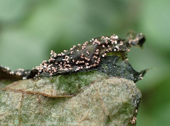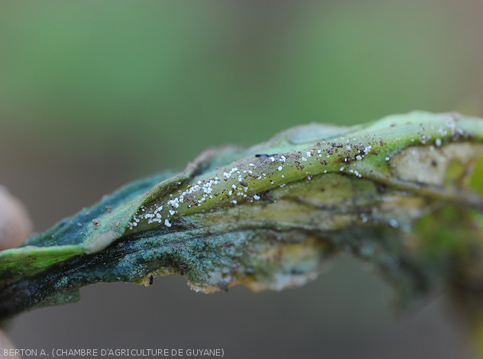 Quelques jeunes micro-sclérotes blancs se sont formés en bordure du limbe de cette feuille de baselle à proximité de la lésion.  <i>Rhizoctonia solani</i>  (Rhizoctone foliaire - web-blight)