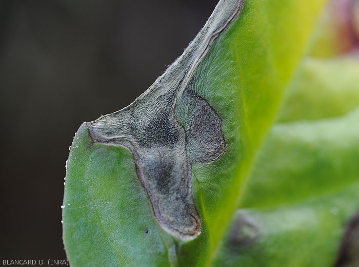 Un discret mycélium peut être observé par endroits sur ou à proximité de cette lésion sur feuille de salade.  <i>Rhizoctonia solani</i>  (Rhizoctone foliaire - web-blight)