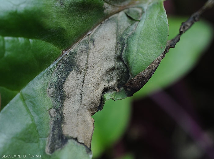 Détail d'une lésion sur feuille de baselle. Les tissus altérés nécrosés présentent une coloration grisâtre, ils sont plus humides et noirs en périphérie. <i>Rhizoctonia solani</i>  (Rhizoctone foliaire - web-blight)