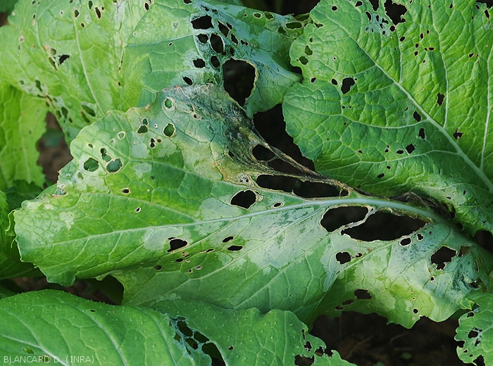 Des lésions plutôt étendues sont visibles sur cette feuille de chou dont les tissus tendres ont pourri. Elles sont d'abord humides, puis livides, et prennent du teinte gris verte en se nécrosant. Localement, le limbe décomposé est tombé conférant à celui-ci un aspect partiellement criblé. (<i>Rhizoctinia solani</i>)